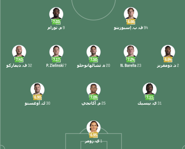 خط الوسط: دينزل دومفريس – نيكولو باريلا – هاكان تشالهان أوغلو – بيوتر زيلينسكي – فيديريكو دي ماركو.