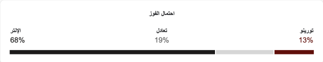 نسبة فوز إنتر ميلان 68%، ونسبة فوز تورينو 13%، ونسبة التعادل 19%.