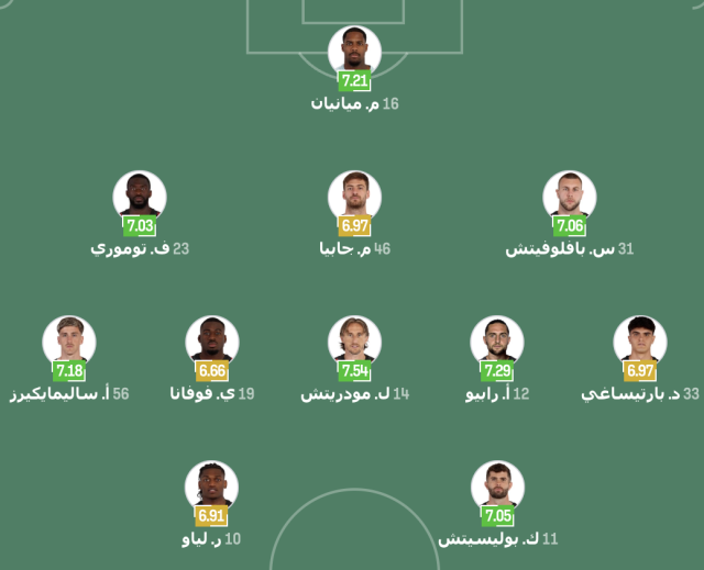 خط الوسط: أليكسيس ساليمايكيرز – يوسف فوفانا – لوكا مودريتش – أدريان رابيو – دافيد بارتيساغي.