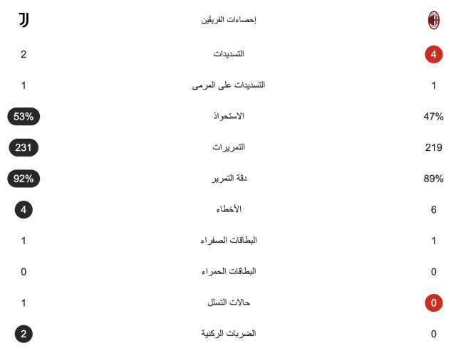 جاءت إحصائيات المباراة لتشير إلى تفوق الروسونيري في المحاولات، بينما كانت السيدة العجوز الأفضل في الاستحواذ على الكرة.