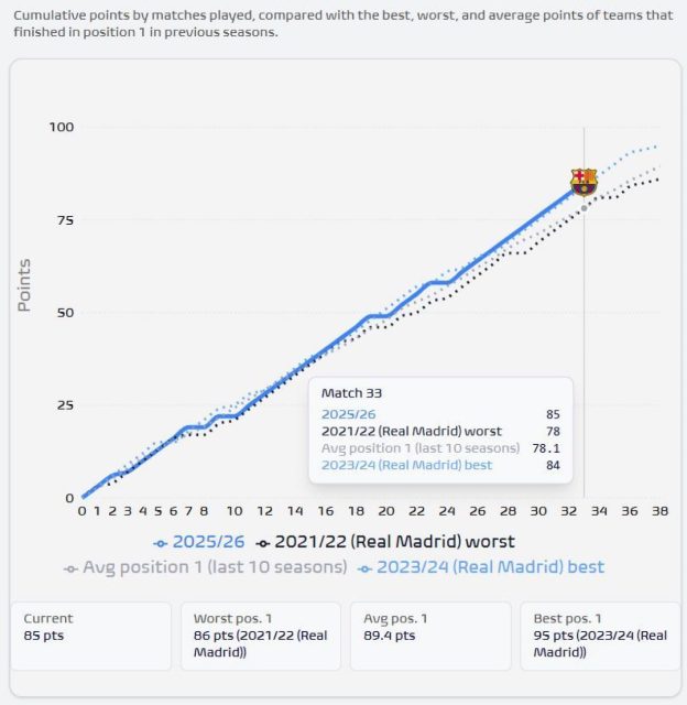 يتفوق برشلونة بفارق نقطة واحدة عن أفضل أبطال آخر 10 سنوات برصيد 85 نقطة من 33 مباراة : ريال مدريد في موسم 2023/24 .