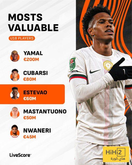 وبحسب موقع لايف سكور ، فإن يامال جاء في المركز الأول بقيمة 200 مليون يورو، ، في حين جاء زميله في برشلونة باو كوبارسي بالمركز الثاني بـ80 مليون يورو .
