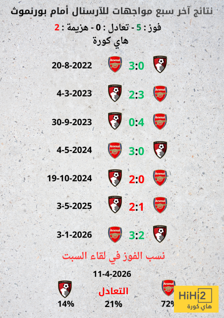 نتائج آخر سبع مواجهات لآرسنال أمام بورنموث