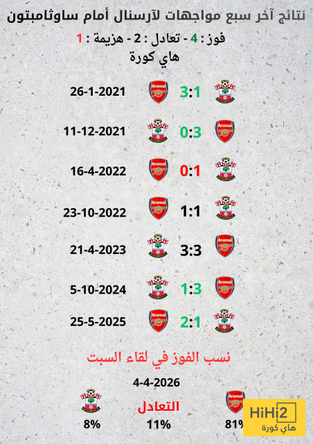 نتائج آخر سبع مواجهات لآرسنال أمام ساوثامبتون